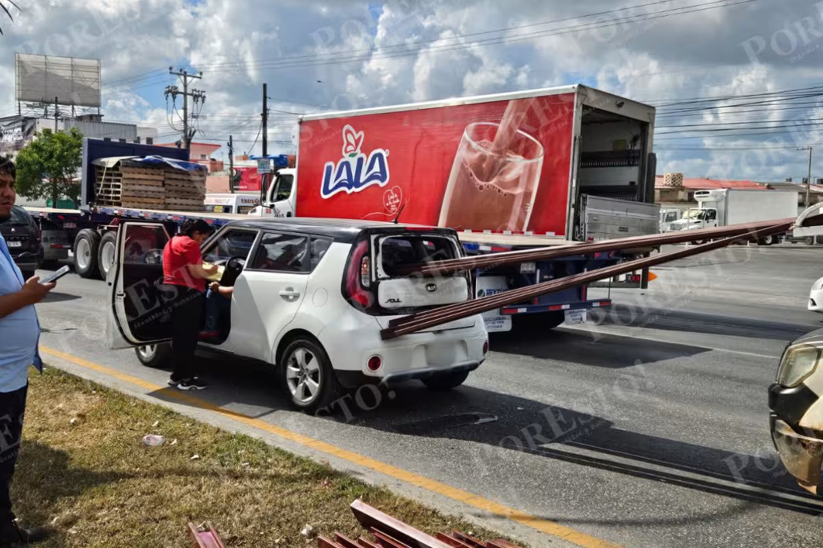 Cancún, Quintana Roo — A family narrowly escaped injury Thursday afternoon when metal rods being transported on a truck flew forward and pierced their car during a traffic stop on José López Portillo Avenue.