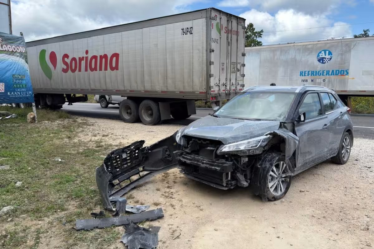 Tulum, Mexico — A family of foreign tourists escaped injury after their vehicle was struck by a semi-truck on the Tulum-Cobá highway near the Maya Train station on Thursday morning.
