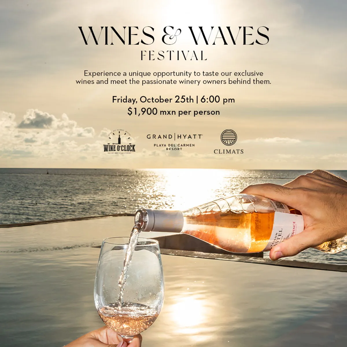 The Wine & Waves Festival will run from 6:30 p.m. to 10:00 p.m. Tickets are priced at $1,900 Mexican pesos per person. Prior reservation is required and can be made via hyattexperiences.com/grand-hyatt/cunpc.